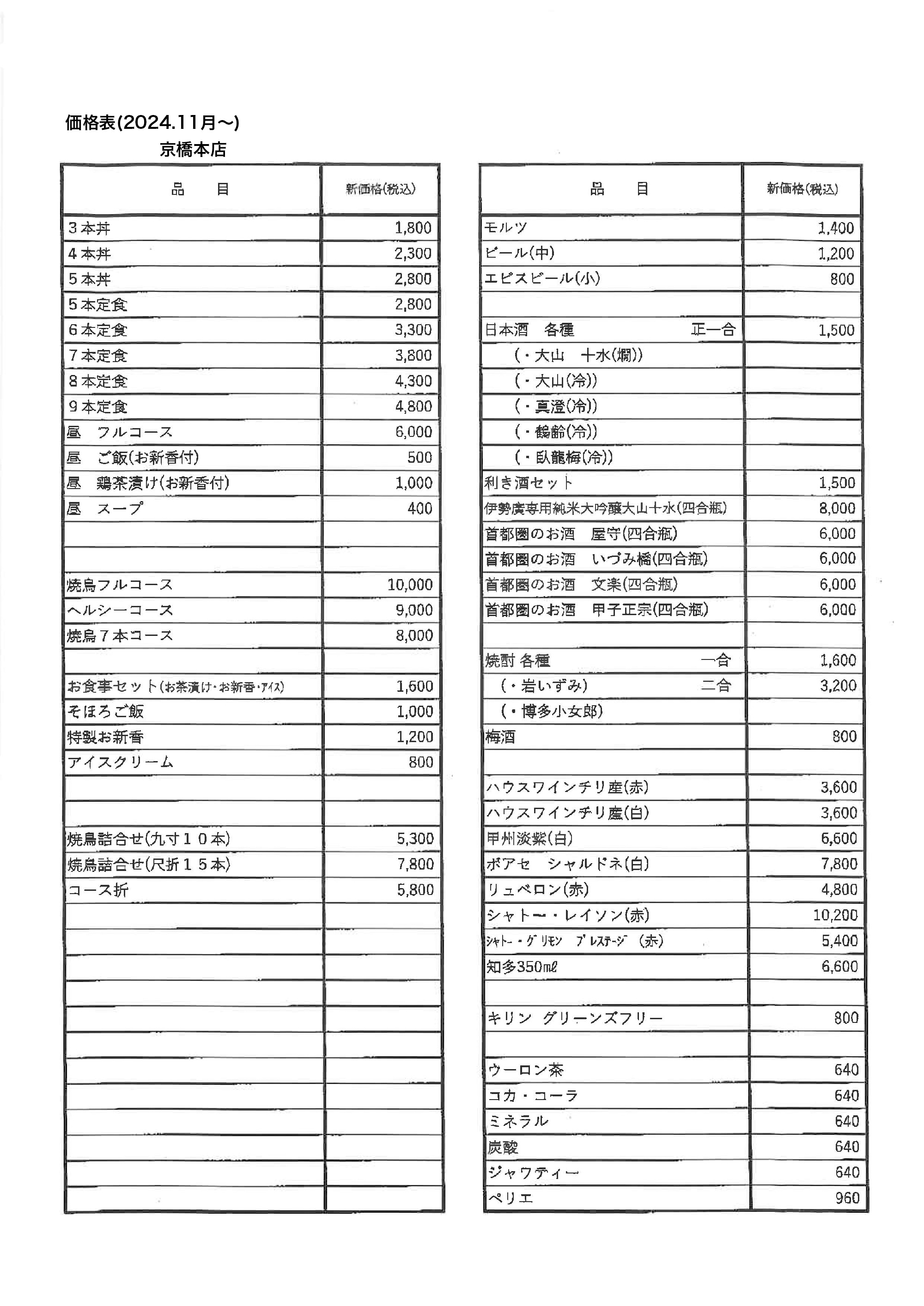 京橋本店は2024年11月1日より提供メニューの価格を改定させていただきます。